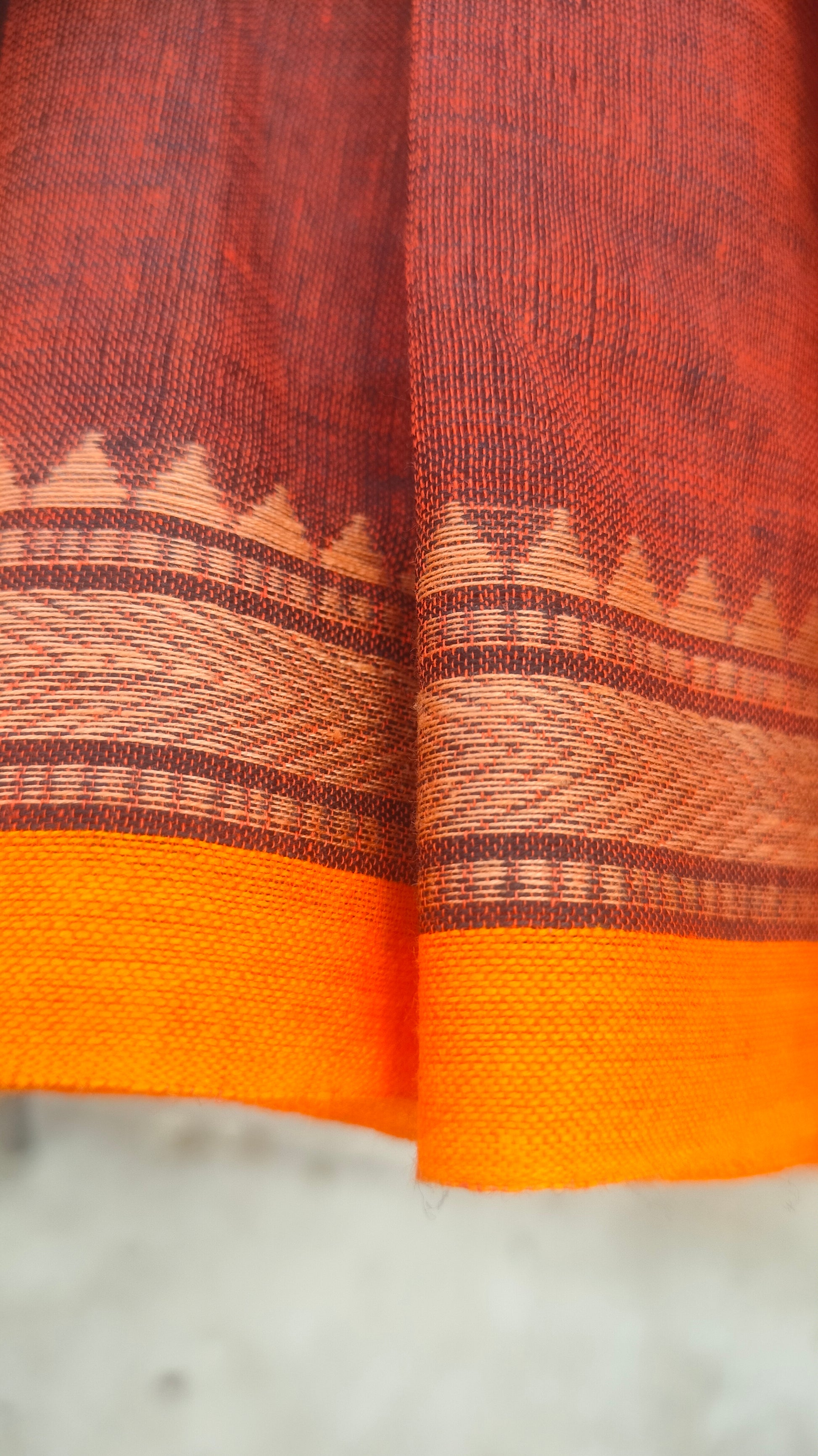 Crafted using traditional Dhonekhali handloom techniques, this cotton saree features a warm rust foundation designed for lightweight, breathable wear throughout the day. The pallu showcases an intricate interplay of brown and black striped weaving, while a mustard-yellow woven border provides striking visual contrast and structural definition. The combination of natural fiber construction and thoughtful color composition creates a versatile piece that transitions seamlessly from casual to formal occasions, embodying the understated sophistication of authentic handwoven textiles.