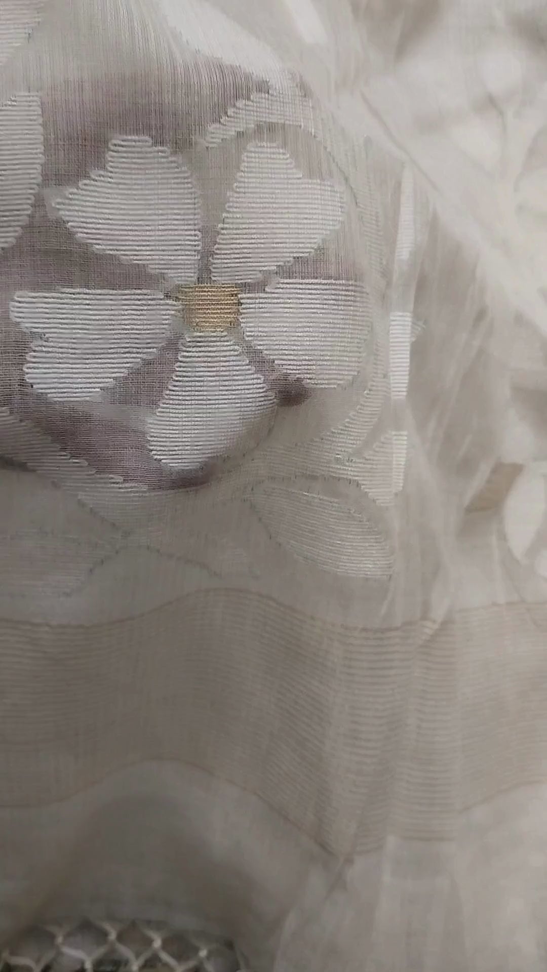 Tiny tone-on-tone white Jamdani buti scatter gently across the body like dew on fresh morning air. The pallu unfurls woven white floral motifs, revealing the artistry of Jamdani in its most subtle, poetic form.